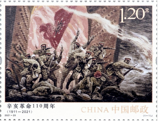 该套邮票由冯远设计,展现了武昌起义时期革命志士高举大旗武装推翻封建统治的场景。画作色彩凝重,人物生动,体现了战争的激烈场面,以及革命者为了推翻腐朽统治阶级时的坚决和不畏牺牲。