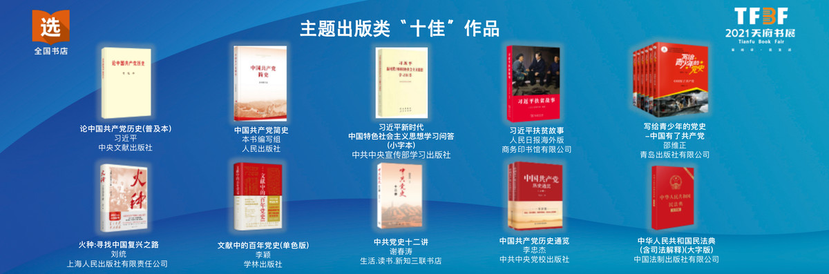 2021年正值中国共产党成立100周年,面向不同读者人群的党史类作品也成了今年主题出版的一大亮点。在本届“主题出版”十佳作品当中,党史话题相关的图书达到7种,相关出版单位党政专业社,也有人文社科专业社,还有致力于大众出版方向的城市出版社。其作品风格更是兼顾了专业、学术、普及阅读等多种角度。除了党史主题以外,“民法典”、“扶贫故事”、“新时代中国特色社会主义思想学习问答”也得到了广大书店的重点关注。