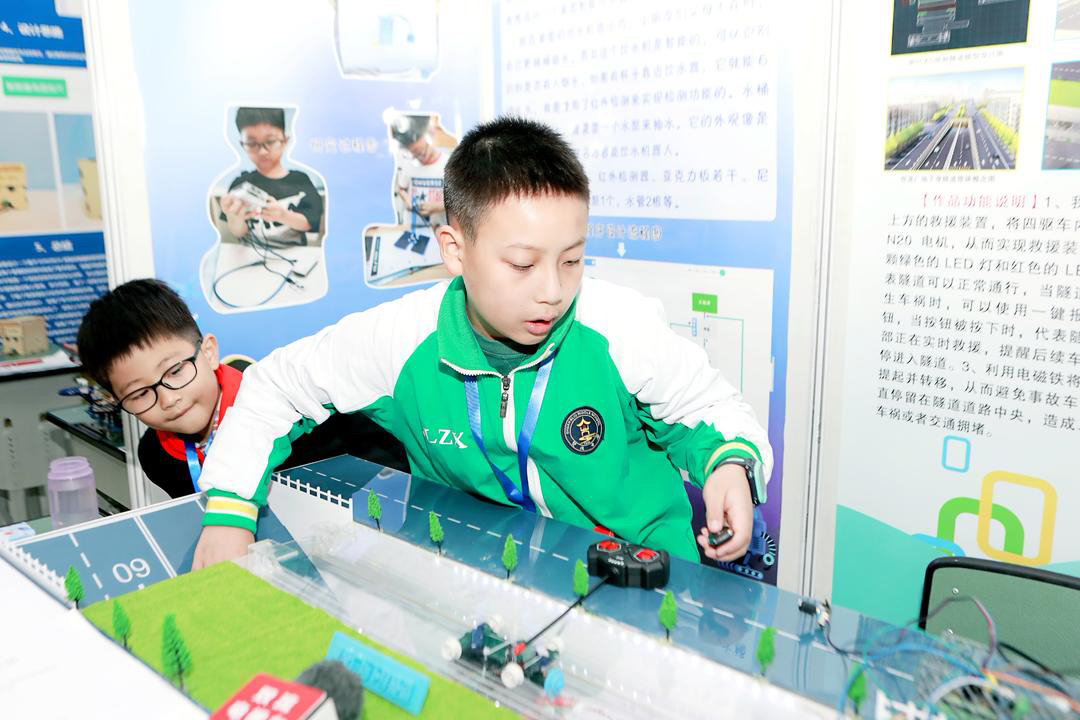 在作品展示区,展示64了件本次大赛的优秀作品。四川省双流中学唐晨奕展示的“基于 Arduino 微型控制器的隧道救援系统”。唐晨奕向大家介绍,该系统可以在车祸发生后,启动应急救援系统,首先将位于隧道顶部的救援装置沿轨道移动至事故车顶部,通过操纵控制电磁吸力装置将事故车辆提起移至安全处,等待事故后续处理,达到快速清障,疏堵、救援车辆通行无障碍的功效。