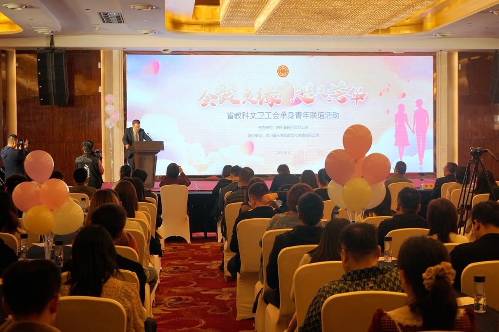 10月17日,四川在线记者从省总工会获悉,“会聚良缘·咫尺芳华”2021年省教科文卫工会单身青年联谊活动日前在成都市举行,活动共吸引了来自四川大学、电子科技大学、西南交通大学、华电集团四川公司等11家单位的近140名单身青年职工参加。活动中,他们在大屏上弹幕互动,倾情表白。最终,现场共有5对单身职工牵手成功。