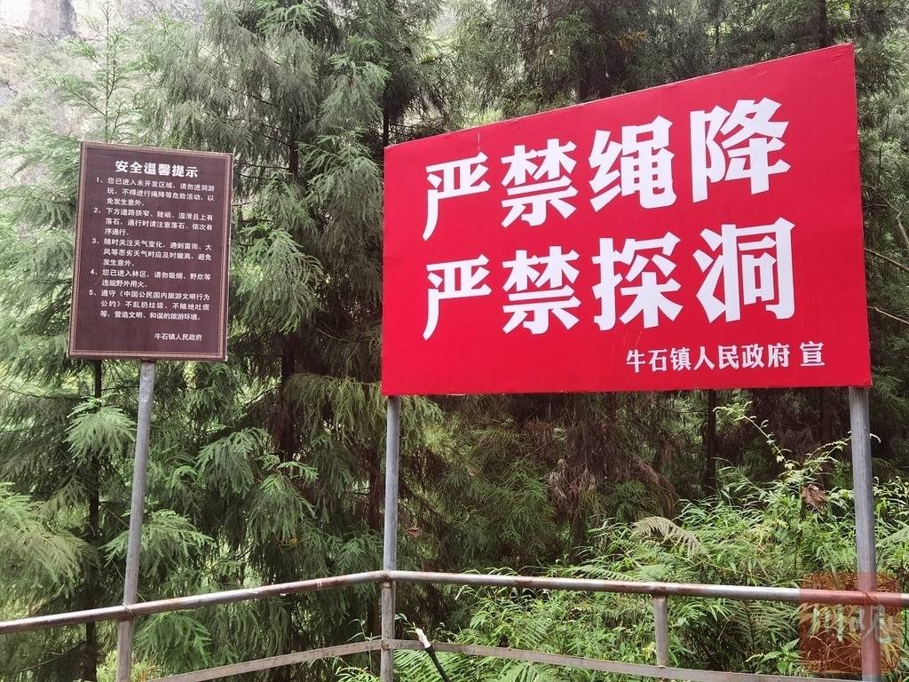 记者在观景平台看到,现场已设立了3块红底白字写着“严禁绳降、严禁探洞”字样的警示牌,显得格外醒目。警示牌横立在平台通往硝洞、岩壁的通道上,封住了前进的道路。