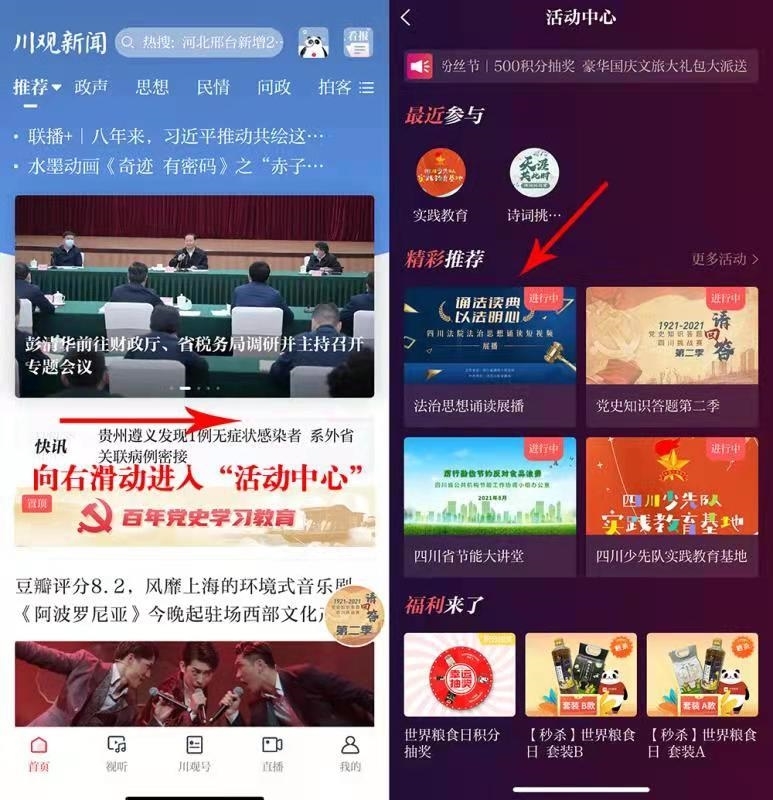 方式二:下载川观新闻APP8.0版本,使用电话号码登录。将屏幕向右滑动进入活动中心,找到相应区域,参与点赞。