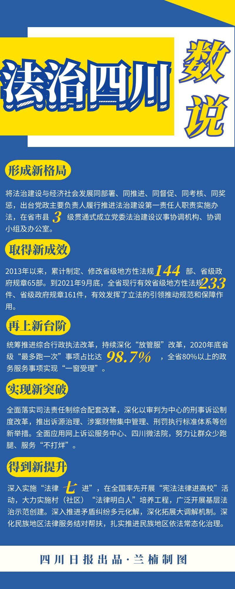 现场,刘志诚还介绍了,近年来我省法治建设取得的成效。据悉,党的十八大以来,省委鲜明提出“治蜀兴川重在厉行法治”,2013年底在全国率先出台《四川省依法治省纲要》,2014年11月作出《中共四川省委关于贯彻落实党的十八届四中全会精神全面深入推进依法治省的决定》。经过8年的努力,全省依法执政、依法行政的能力和水平不断提升,立法、执法、司法、普法守法工作得到全面加强,城乡基层治理得到全面夯实,全社会的法治意识显著提高,为顺利开启全面建设社会主义现代化四川新征程奠定了坚实的法治基础。