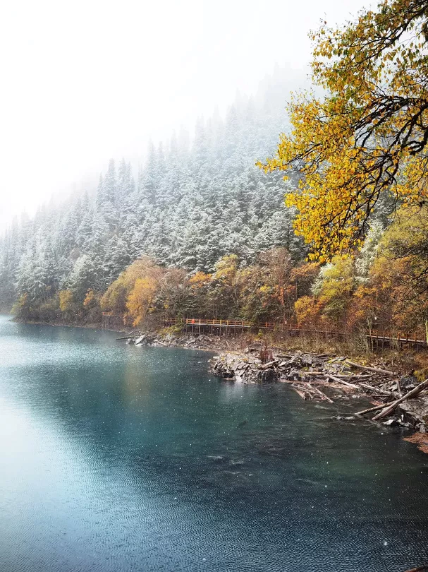 白雪将片片彩林和云雾完美融合,九寨沟宛若人间天堂,碧水如玉带般在山间挥舞,灵动万分。