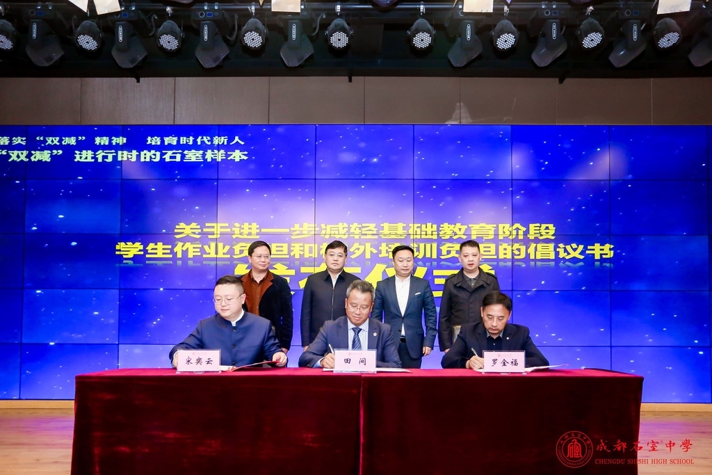 石室中学代表田间、石室中学教育集团代表宋奕云、四川省中学校长协会代表罗金福共同签署并发布“双减”倡议书,提出:提高政治站位,强化学校教育的主阵地作用;作业减量增效,提高设计质量指导学生完成;促进多元发展,提供课后服务满足学生需求;倡导优良师风,杜绝做校外兼职和有偿家教;提升办学质量,确保学生在学校内学足学好;加强资源整合,建设家校社会协同育人机制。