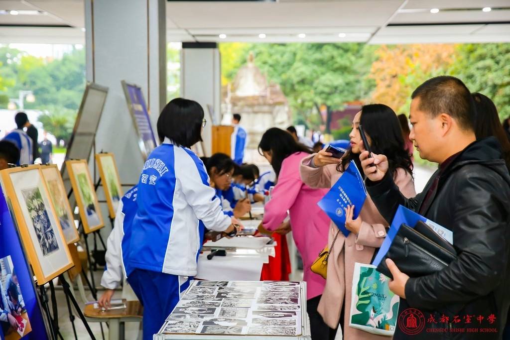 在“四川省落实‘双减’精神,培育时代新人”现场交流会前,石室中学设了“双减”行动现场展示区,陈列着版画、书法、熊猫研学基地等多个展位,一旁学校的管弦乐团也在演奏着悦耳的世界名曲,吸引上百名老师驻足拍照或询问。