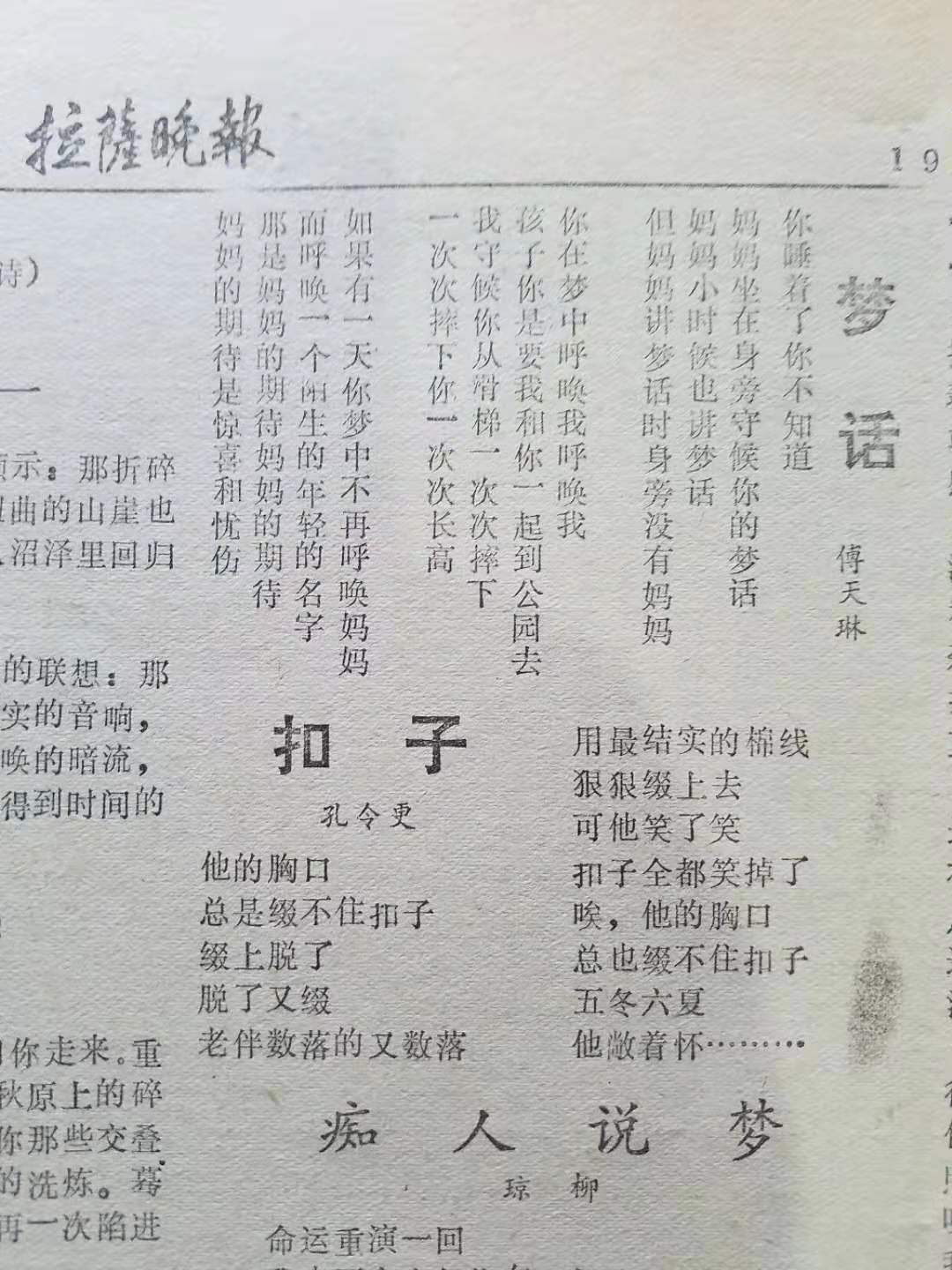 《拉萨晚报》20世纪80年代中期发表傅天琳的诗歌截图