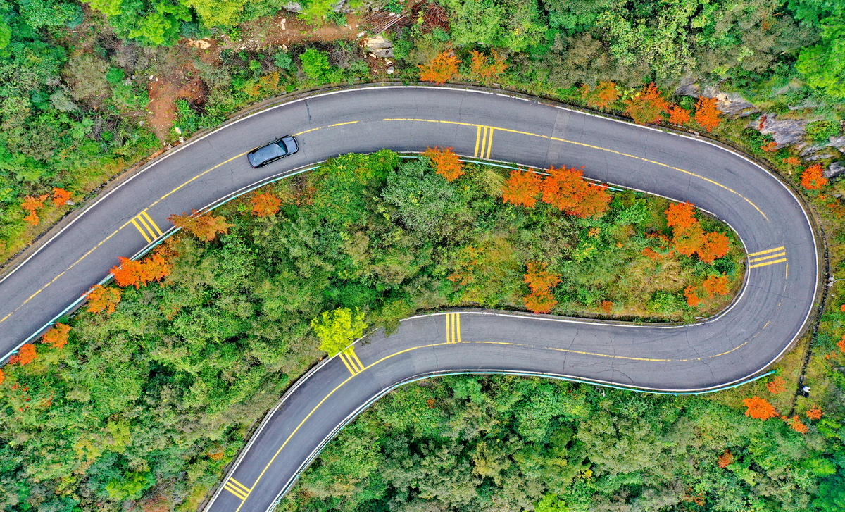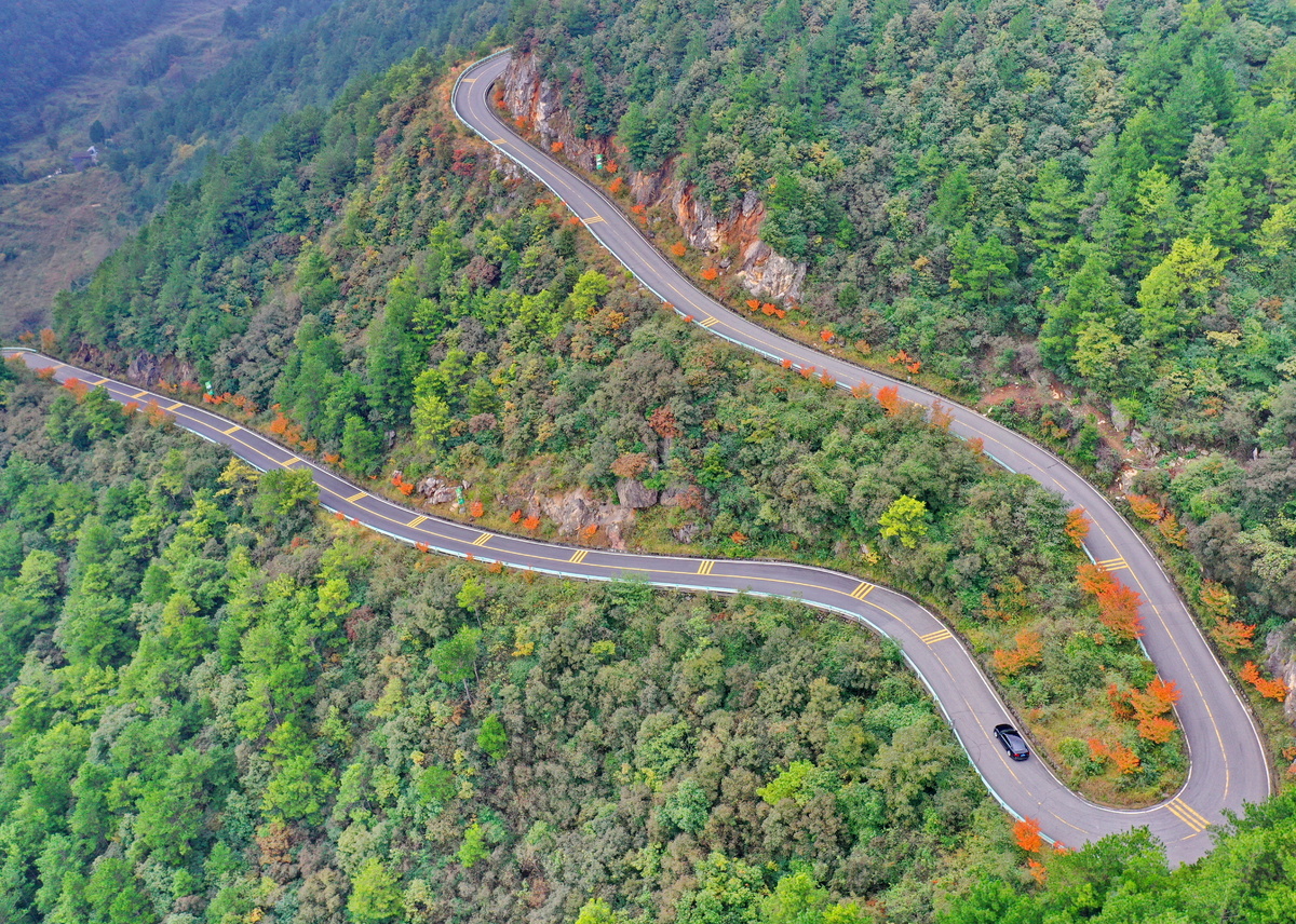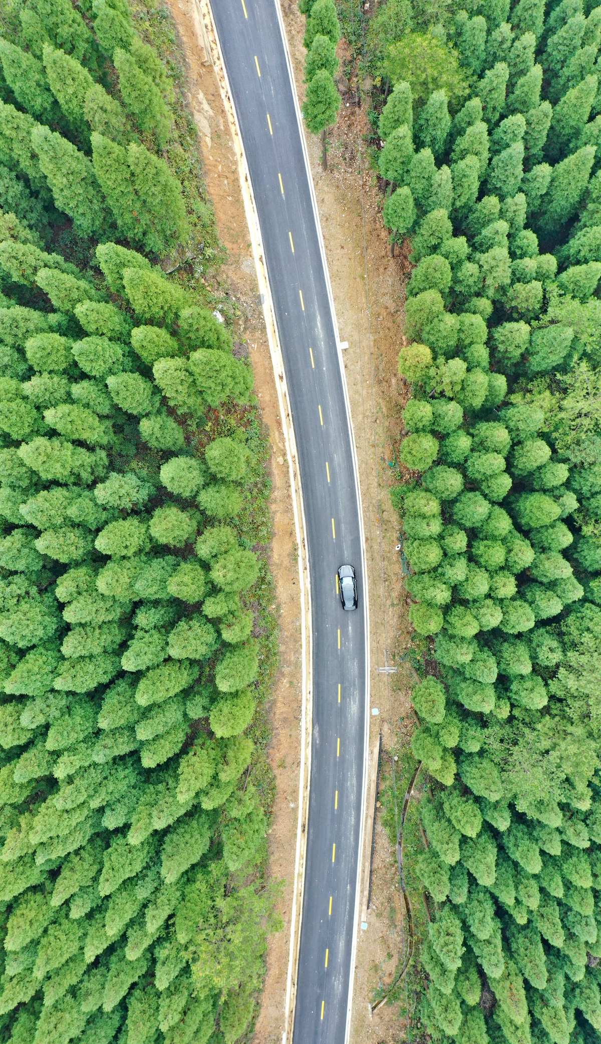 位于四川省广元市利州区的天曌山半山腰,一辆轿车行驶在山林中。