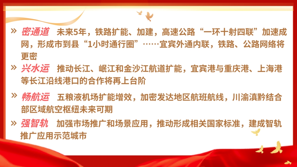 这给宜宾进一步打开水陆空开放通道以底气。党代会报告提出:高质量建成全国性交通枢纽中心,全面融入西部陆海新通道建设。可以看见,沿着“X”点的开放通道正纵横展开:密通道、兴水运、畅航运、强智轨。
