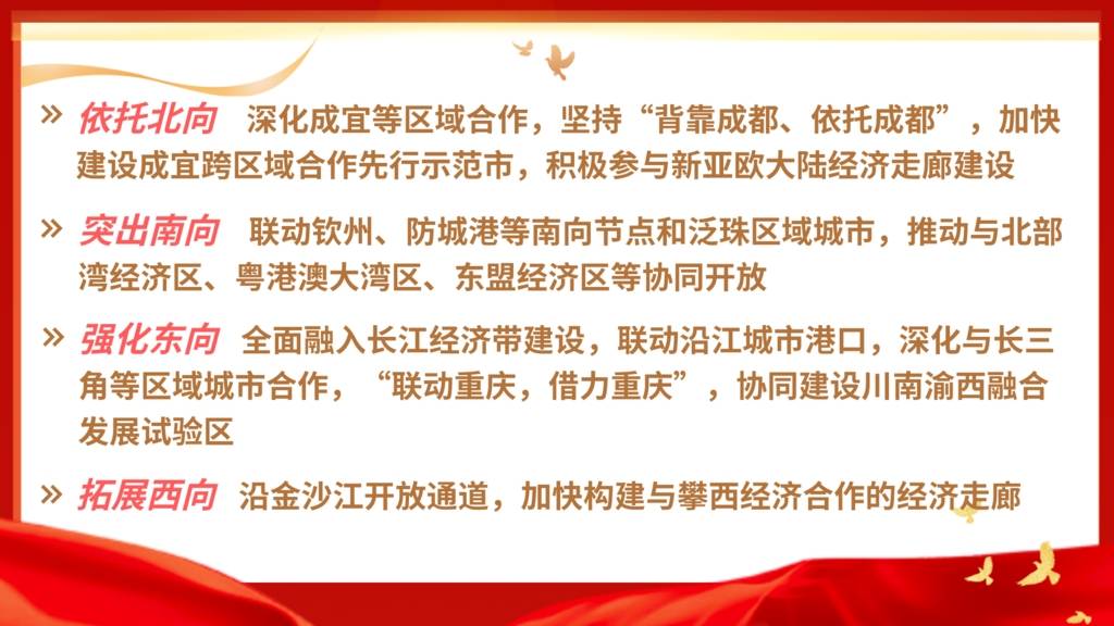 根据报告,宜宾不仅要争做产业的高地,还要做开放的高地,将坚持“依托北向、突出南向、强化东向、拓展西向”,构建全方位、多层次、宽领域的开放合作新格局。