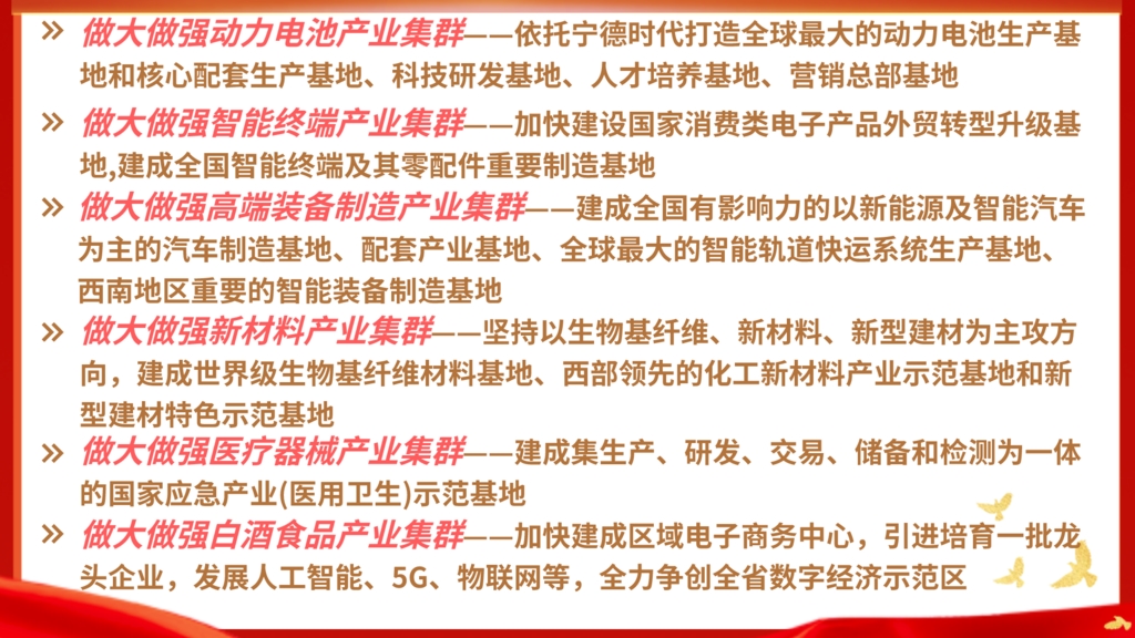 为此,宜宾将继续做大做强动力电池、智能终端、高端装备制造、新材料、医疗器械、白酒食品等“5+1”产业集群,并全力打造2-3个具有全球竞争力的知名品牌和主导产业,谋划多个高能级产业集群将形成梯队,以渐次铺开之势,高质量建成成渝地区双城经济圈经济副中心,加快建成国家创新型现代产业发展示范区。