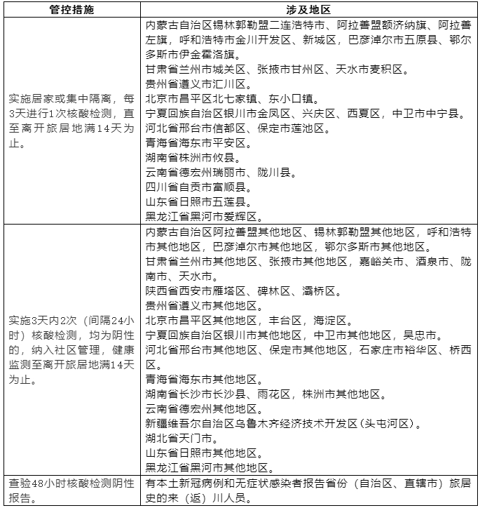 国内部分地区来(返)川人员管控措施