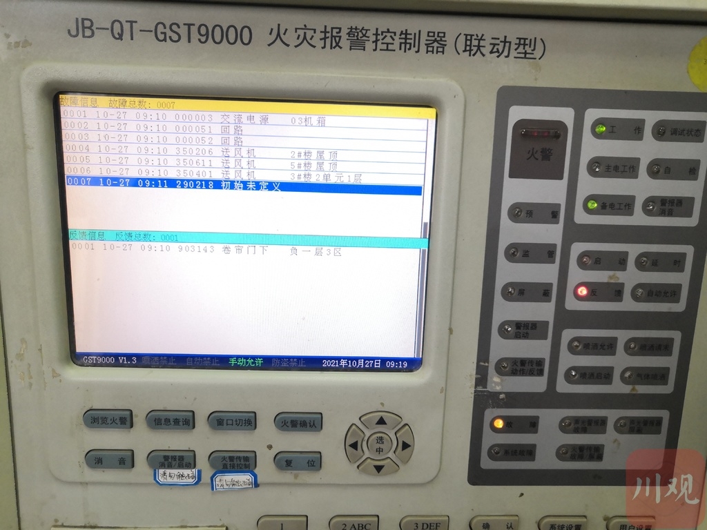 位于成都市龙泉驿区西河镇成洛大道5632号的九峰东方明珠小区,于2014年交房投用,目前有1500多户业主,是当地规模较大的小区。27日上午9时许,一进小区,暗访组直接来到小区消防控制室,发现控制室主机处于瘫痪状态,无法正常使用。暗访组成员、省消防救援总队二级指挥长吴锦宜进行现场检查和测试后,告诉记者,这是火灾报警控制器报故障,部分消防联动设备,比如送风机、防火卷帘、消防电话、火灾报警探头出现故障,并未反馈到系统主机。
