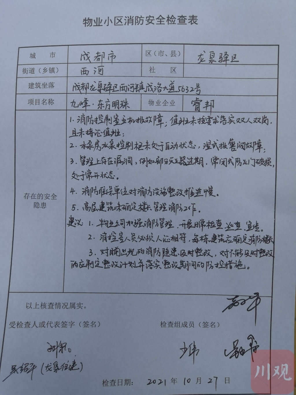 暗访组向小区管理方指出了当天发现的诸多问题,并提出整改意见。暗访组要求:对目前出现的消防隐患要及时整改,对不能及时整改的,应制定限时整改计划并落实整改期间防控措施。同时,要进一步加强消防管理,提高管理水平,持续开展日常巡查、宣传,确保小区消防安全落到实处。