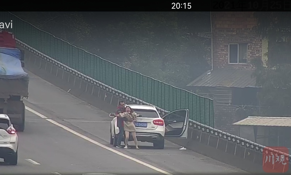 当日14时许,四川省高速交警四分局一大队信息研判指挥中心监控显示,在G5京昆高速公路成都往雅安方向西康大桥上,一辆白色越野车停靠在桥边应急车道内,车尾部一中年男子和一年轻女子扭扯在一起,女子频频向过往车辆招手呼救,情况十分危急。