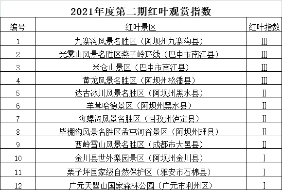 注:根据四川省内各主要红叶景区所处的地理位置、环境气候条件以及树叶变色的程度等,将“红叶指数”分为Ⅲ级。