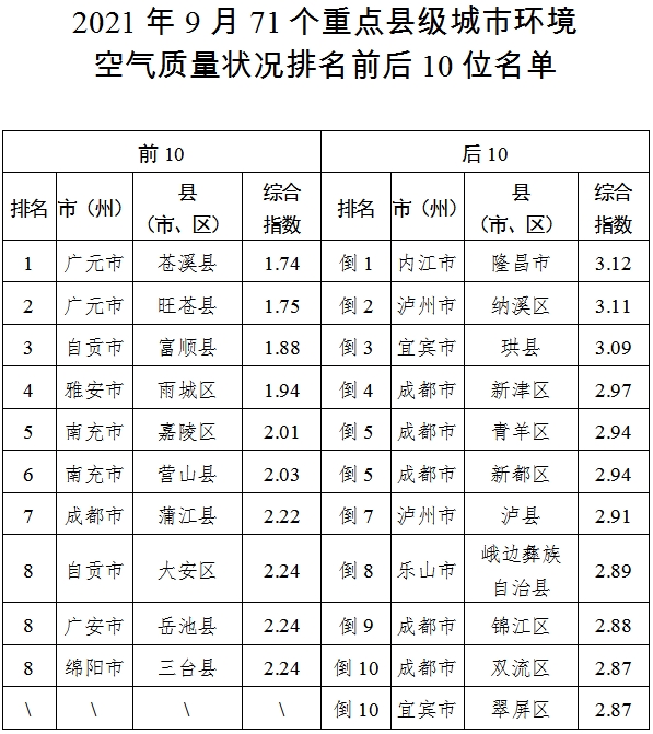 9月,四川71个重点县级城市中,环境空气质量较好的前10名依次为苍溪县、旺苍县、富顺县、雅安市雨城区、南充市嘉陵区、营山县、蒲江县、自贡市大安区和岳池县及三台县(并列);环境空气质量较差的后10名依次为隆昌市、泸州市纳溪区、珙县、成都市新津区、成都市青羊区和成都市新都区(并列)、泸县、峨边彝族自治县、成都市锦江区、成都市双流区和宜宾市翠屏区(并列)。