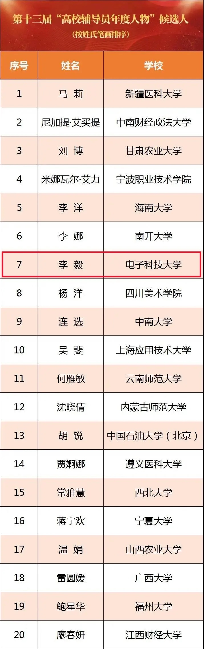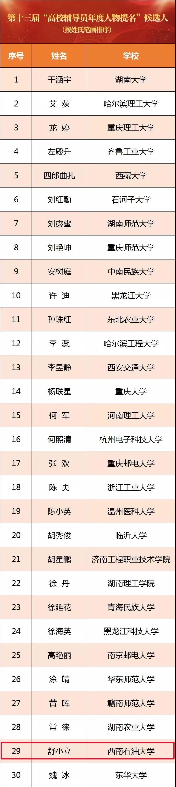 四川高校有两位教师入选,电子科技大学的李毅入选“高校辅导员年度人物”候选人,西南石油大学的舒小立“高校辅导员年度人物提名”候选人。
