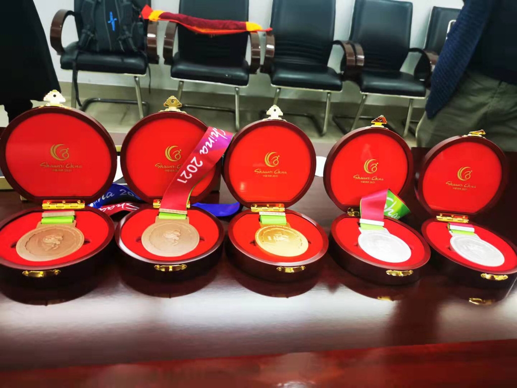 在一间会议室,谢环宇从背包里掏出一堆奖牌一字排开:一金、两银、两铜。随后,又将一面写有“爱心帮扶献真心,助残就业情永存”的锦旗交到市残联负责人手中。