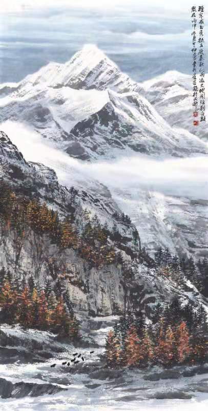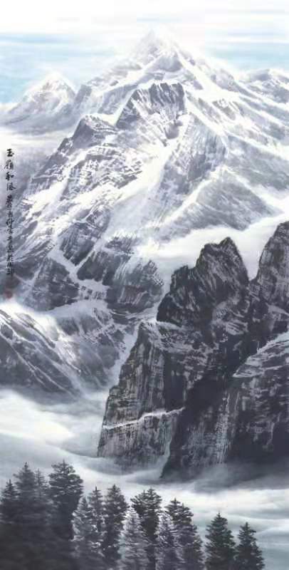 提到高原雪山画,就不得不提四川省文学艺术界联合会副主席李兵。他独立探索提炼出的中国画新皴法——“块斧劈皴”(也称为“李兵冰雪皴”)和独特的“挤白”“衬白”染雪法等,填补了中国水墨高原雪山画法的空白,开创了冰雪山水画的新境界,成为中国水墨雪山画体系的创立者和领军人物。