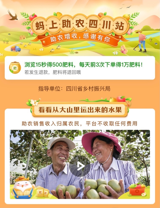 此次专场活动,是四川省乡村振兴局和浙江支付宝公益基金会联合签署的《支持四川巩固拓展脱贫攻坚成果同乡村振兴有效衔接合作协议》的一个具体落地。活动期间,当地多种特色农产品受热捧,其中,86吨眉山果冻橙、76吨蒲江黄心猕猴桃、66吨大凉山丑苹果、45吨攀枝花凯特芒和1.7万箱安岳柠檬被网友搬回了家。