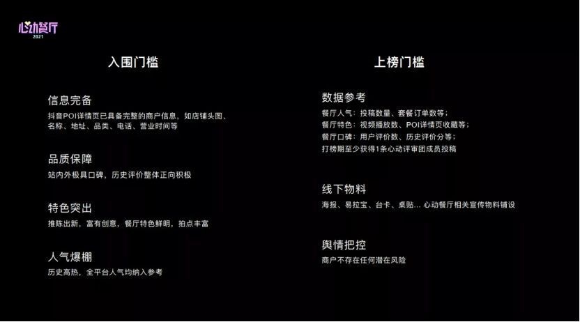 本次抖音心动餐厅2021入围餐厅综合了各个数据,从不同维度考核,最终确认入围。这些成功入围的商家将进入打榜冲刺阶段,通过餐厅人气、餐厅特色、餐厅口碑、餐厅品质、达人投票等多个维度来进行评估,具体又细分为投稿数量、套餐订单量、视频播放数、用户评价数、历史评分等。以成都为例,由粉丝数54.8万的“胖娃吃遍成都”、粉丝数19.4万的“肥宅快乐妹”、粉丝数8.6万的“成都儿娃子国国”等22位博主组成的心动评审团也将到店打卡。