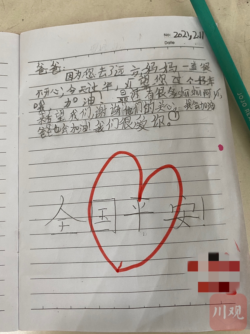 今年除夕夜,航航给不能回家的爸爸写了一封信。“因为您去了远方,妈妈一直很不开心。今天过年,希望您过个好年哦,加油!”航航还告诉爸爸,有很多叔叔阿姨在关心自己,“我会加油爸爸也会加油!我们很爱你!”