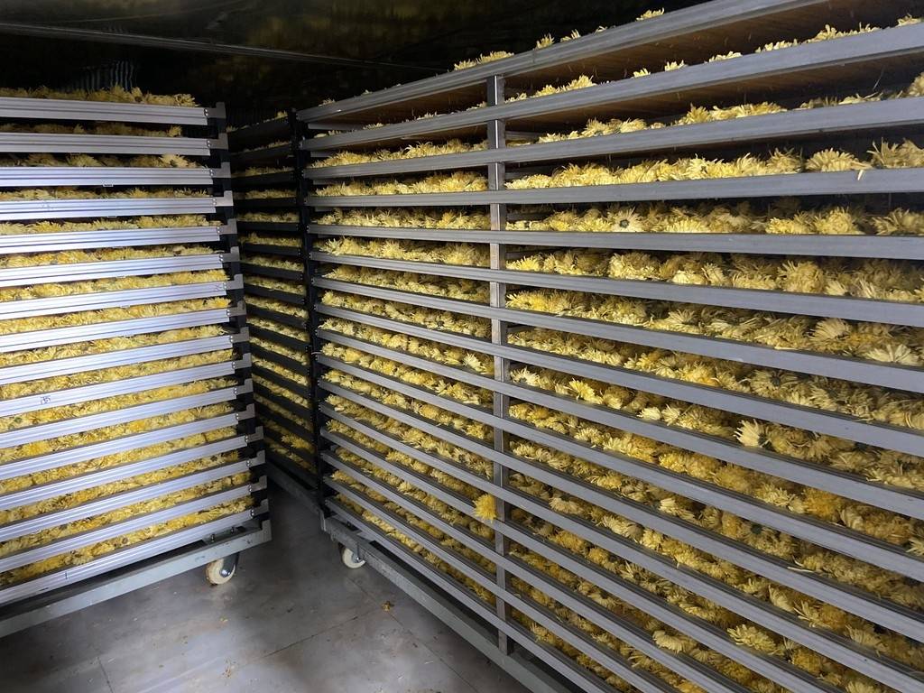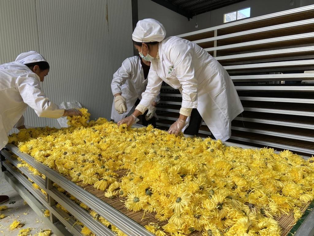 “目前咱里村合作社有正式员工7人,平均年龄46岁。每年8—12月采摘季节按每小时10元增加临时工30人。只要身体健康,能做手上活,签了安全责任书后,就能来上班。每年大概要给她们30多万元薪酬,这也为村里36位农村妇女提供了就业岗位,带动了当地的经济发展。”目前,合作社与企业合作,成功引进甘孜州诗和远方农业科技有限责任公司,建立厂房,从事金丝皇菊加工、销售工作。甘孜州诗和远方农业科技有限责任公司副总经理华露说,“我们按照一、二、三等级7元、6元、4元不同价格,分批次收购菊花。去年咱里村共收购菊花一百三十多万斤,今年咱里村每天能采购五千斤菊花。公司在泸定县设置有两个加工厂,包含八条生产线,其中咱里村就包含一个加工厂、四条生产线,这朵朵菊花让咱里村的老百姓家中都开出了‘致富之花’。”
