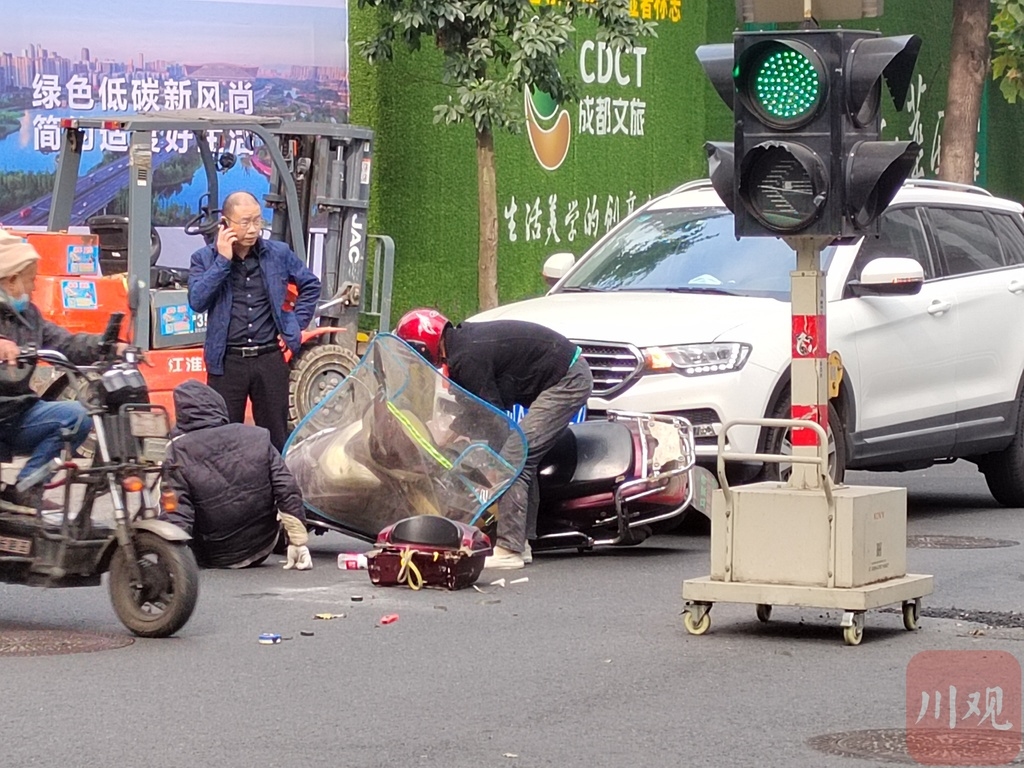 11月5日下午2点10分左右,成都市华兴东街红绿灯十字路口处,发生一起交通事故,一辆城市越野车和一辆电瓶车在路口“亲密接触”。交通民警和医疗部门将快速到达现场处理。
