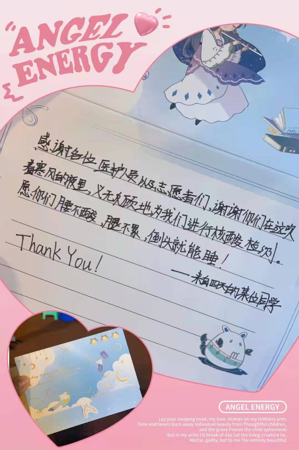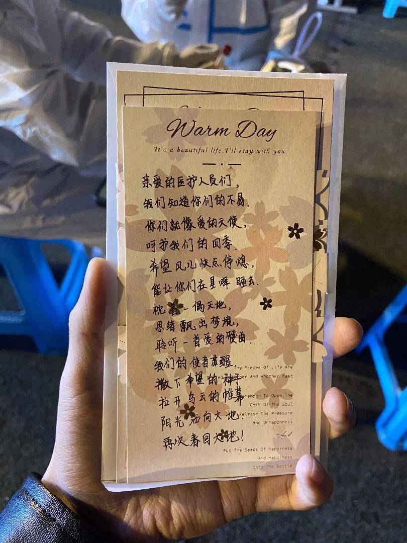 在排队等候时,许多同学都自发的制作了小卡片,在做完核酸检测时送给医护人员。在他们的眼中,这些白衣天使们,就像夜空中的“守护者”,守护着安全,守护着安心,守护着这座城市。