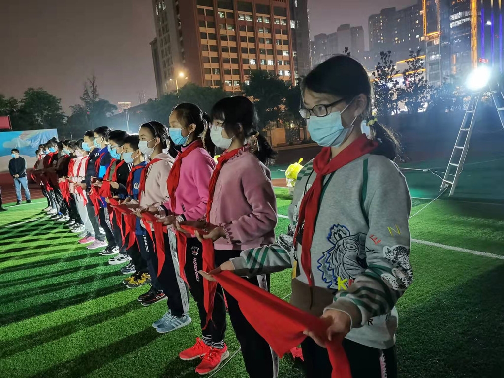 成都高新区锦城小学学生,远远用红领巾向前来做核酸检测的医护人员致敬。