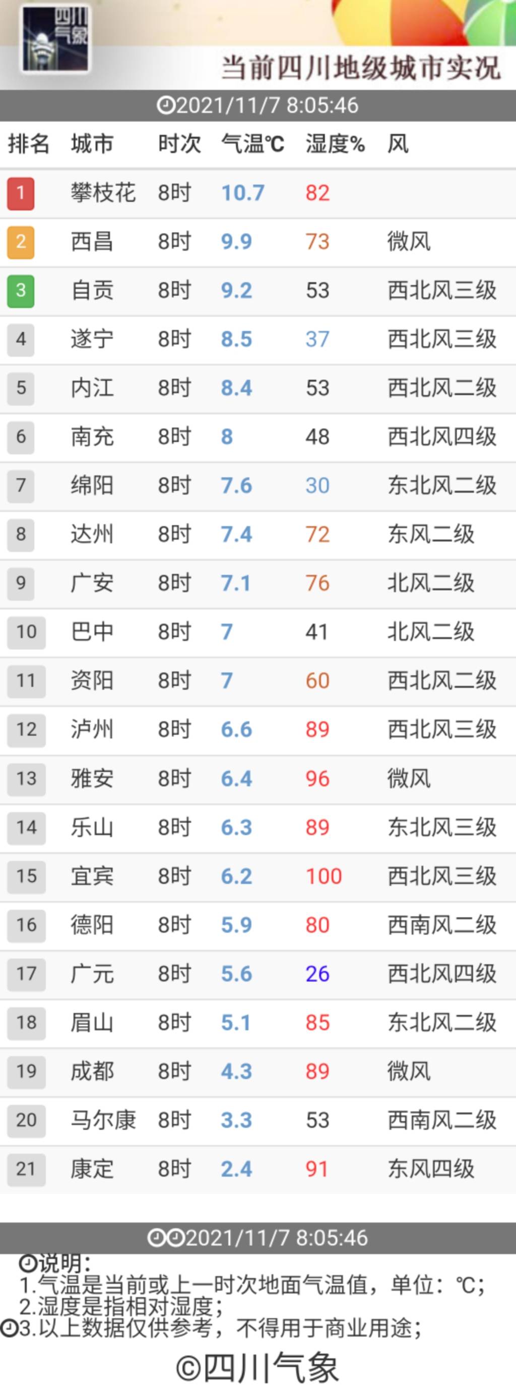 最后,一起来看看“立冬”之日四川各地的天气情况。据四川省气象台今天早间发布的天气预报: