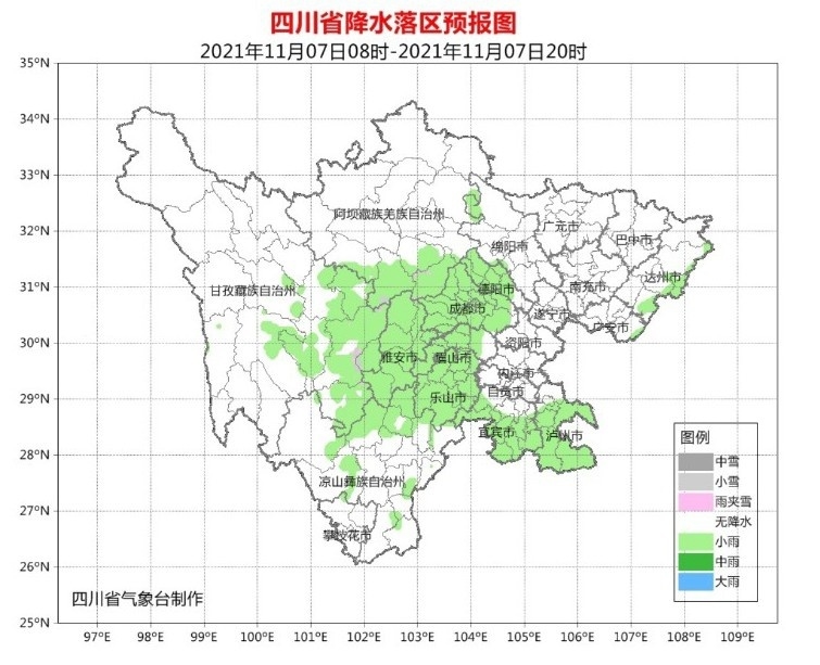 今天白天,盆地大部阴天,其中德阳、成都、雅安、眉山、乐山、宜宾、泸州、达州5市的部分地方有小雨;阿坝州南部、甘孜州东部和南部及凉山州北部阴天间多云,部分地方有阵雨(雪),川西高原和攀西地区其余地方多云间晴。