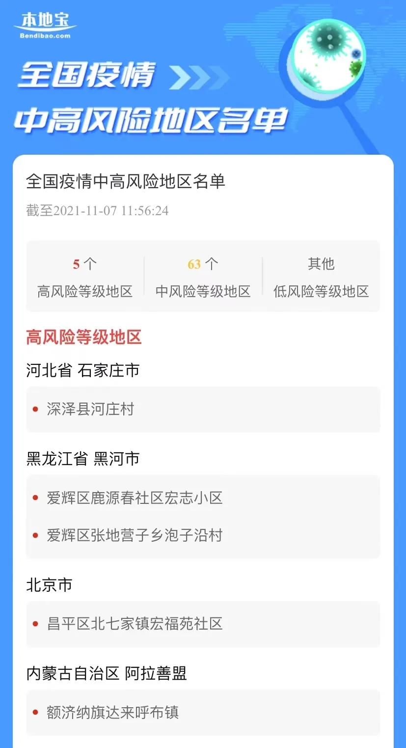本次疫情呈现传播链条多、传播速度快、传播范围广的特点,“外防输入、内防反弹”的防控形势依然严峻复杂。截至11月7日11时,我国有5个高风险地区和63个中风险地区。