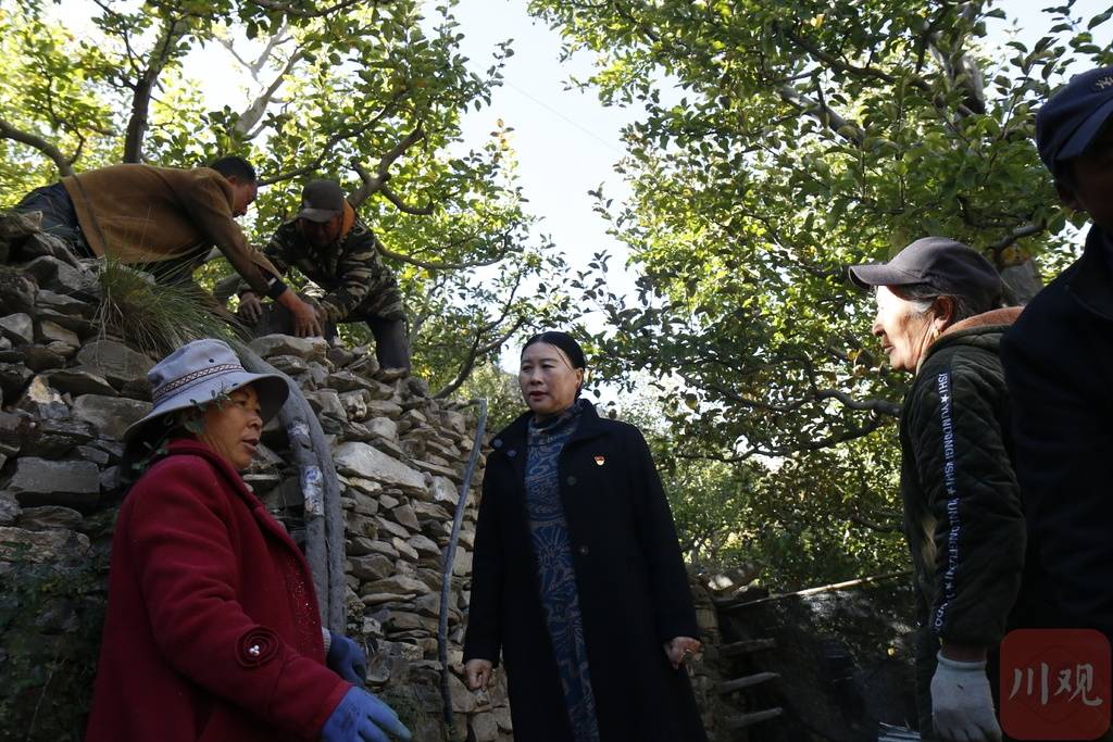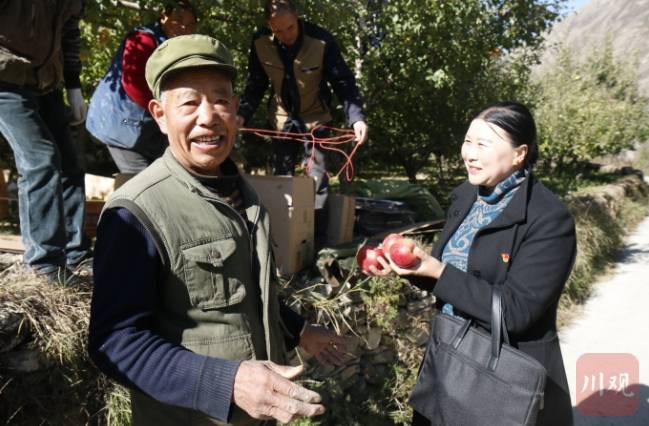 11月8日上午,阿坝州小金县阳光灿烂,达维镇冒水村,村民袁长荣雇请了7名亲朋,趁着好天气,在自家地里采摘刚刚成熟的苹果。树枝间采摘,树下装箱,路上运输,大家各忙各的,有条不紊。“感谢咱村的当家人陈望慧,她出头把路修补好了,现在苹果运出村一个不会烂,能卖上好价钱。”袁长荣忙里偷闲与记者交流。