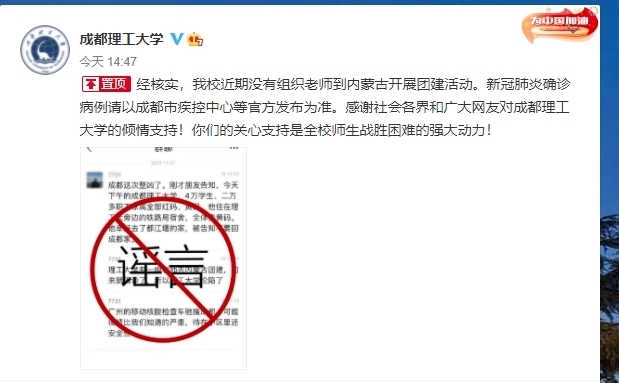 近期,成都理工东苑小区出现本土确诊病例,随后,“成都理工大学老师去内蒙古团建后回蓉确诊”的言论在网上传播。11月8日,成都理工大学官微发文辟谣,全文如下:经核实,我校近期没有组织老师到内蒙古开展团建活动。新冠肺炎确诊病例请以成都市疾控中心等官方发布为准。感谢社会各界和广大网友对成都理工大学的倾情支持!你们的关心支持是全校师生战胜困难的强大动力!