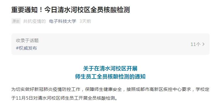 学校发布《告全院师生员工书》,崇州校区本周末学生不出校门,实行封闭管理,绵竹校区学生不得离开当地。如有特殊情况,必须按照“学生家长——辅导员——二级学院——学生处——疫情防控办公室”的流程逐级请假报备,返校时提供24小时核酸检测阴性证明。从11月5日起,近14天(含周末),崇州校区所有教职工、从业人员不得离开崇州。