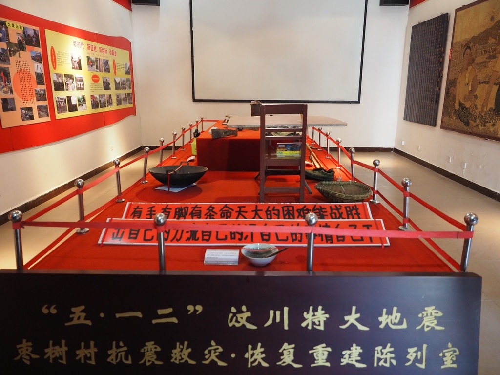 在石光武家的对面,是“枣树村抗震救灾·恢复重建陈列室”。这是地震当年枣树村村民自己建的博物馆。进陈列室第一眼就看到,两幅缩小版标语陈列在最显眼位置,陈列台上还放着当时重建的工具、铁锹、锄头、灰刀、锛锄等重建工具,陈列室四周展示着枣树村重建时的照片,石光武建房的照片被放在显眼位置。