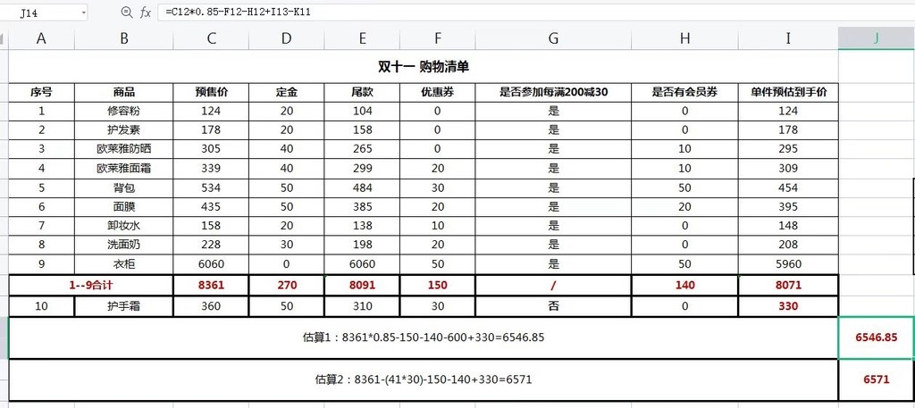 与她相比,由于要购买衣柜这个“大件儿”,张辰的计算更加细致。10月31日,她在Excel表里整理出预售价、已付定金、尾款、优惠券、是否参加每满200减30,是否有会员券、预估价,怕理解不到位,她还作出了两套估算方案。花费两个多小时的时间,张辰说:“双十一规则更多了,感觉很晕,毕竟没有卖错的,只有买错的。”在这种情况下,她更加谨慎。