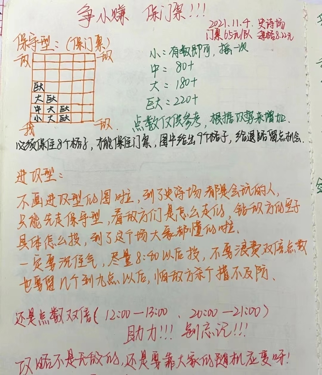 许大陆遇到过“求保本”队、“做个人”队、“别惹我队”,这些队名也正是她的心路历程。10月27日,许大陆在笔记本上写的攻略标题是“我们的目标是保本”,打了三个感叹号;10月28日,标题变成了“今日目标:保本+干死蓝队”;10月29日,这股霸气消失了,标题又变成“今日目标:随缘,看天意”……