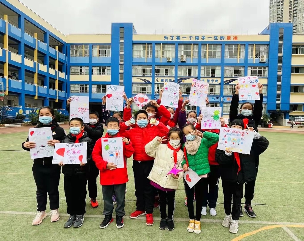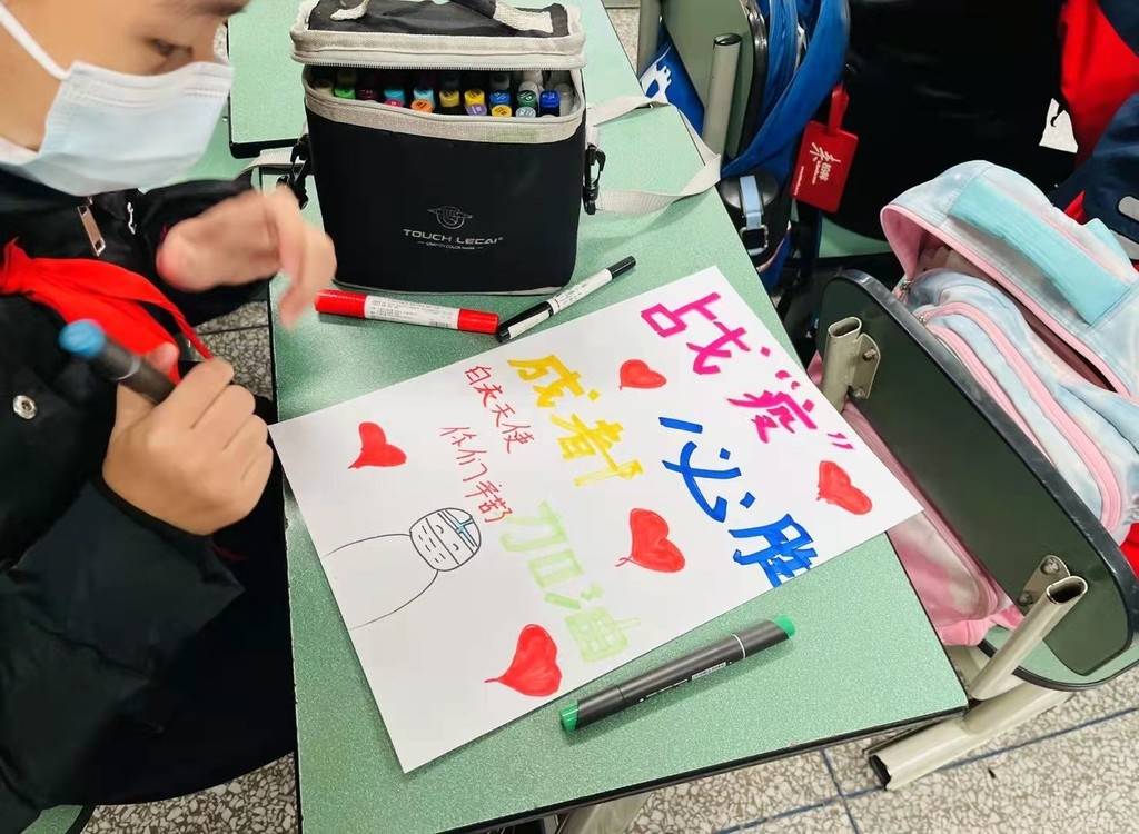 检测中,师生得知医护人员、社区工作人员连续工作没有休息、听到他们的声音已嘶哑,都纷纷为他们点赞。学校德育处抓住教育契机,组织先完成核酸检测的学生回到教室,利用美术课绘制感恩卡,用稚嫩的语言与五彩的图画表达感谢,致敬守护者。鲜思源同学用心制作两颗立体心形感恩卡送给医护人员,以表达他的感恩之心。蒲妍荧同学用POP字体绘制感恩卡,感谢最可爱的人,为成都加油。