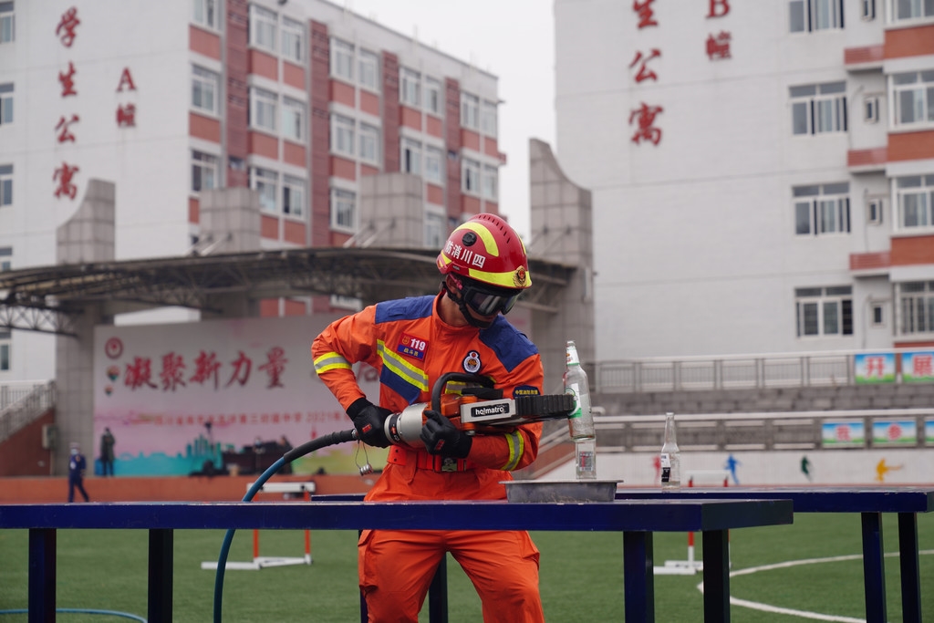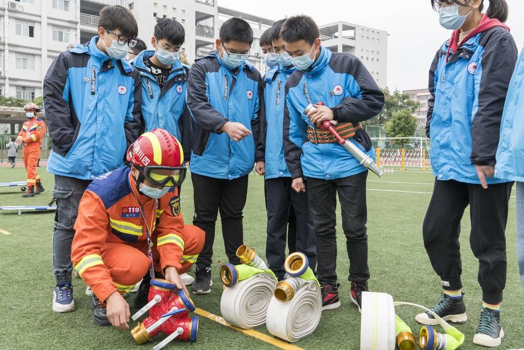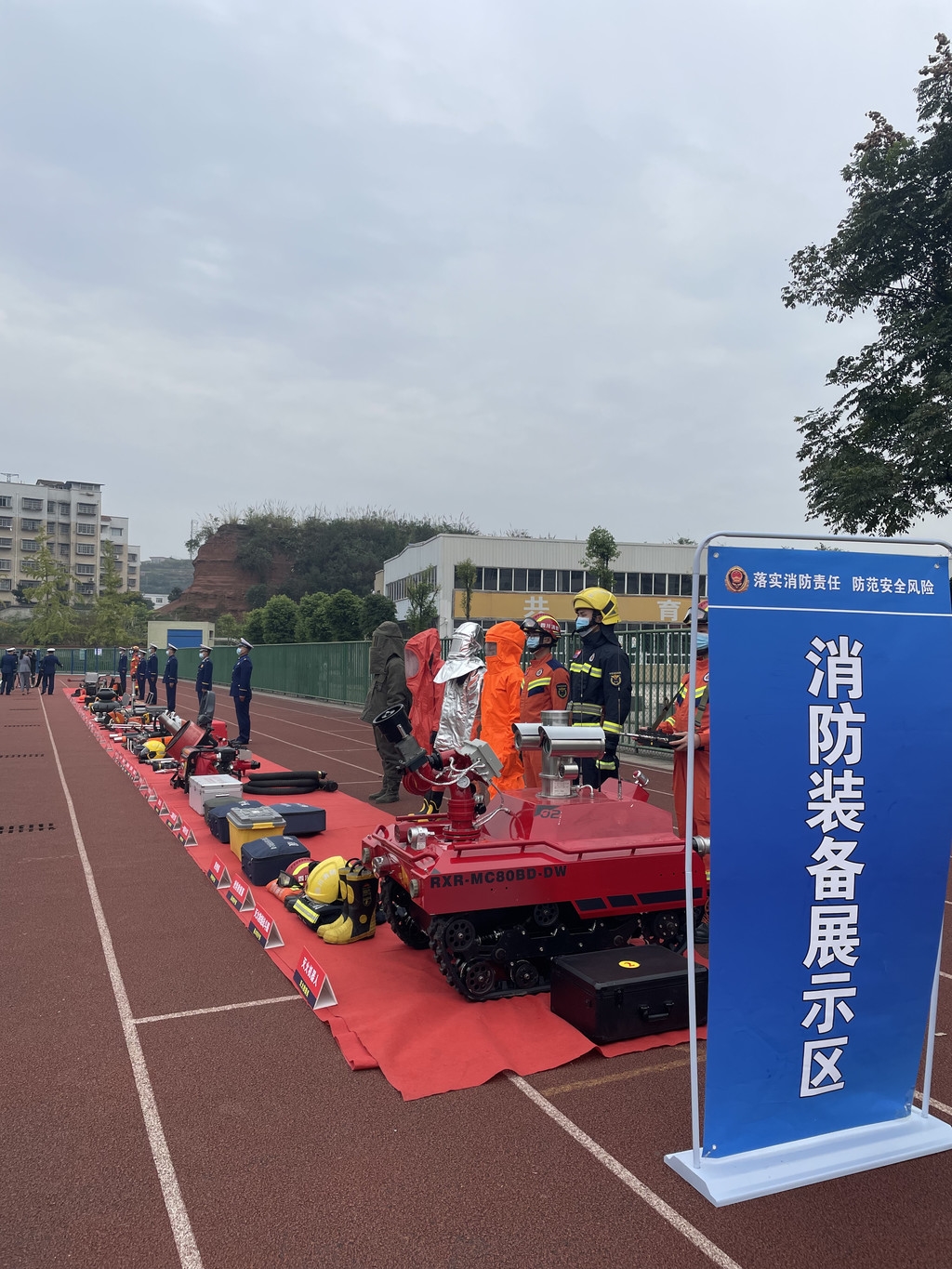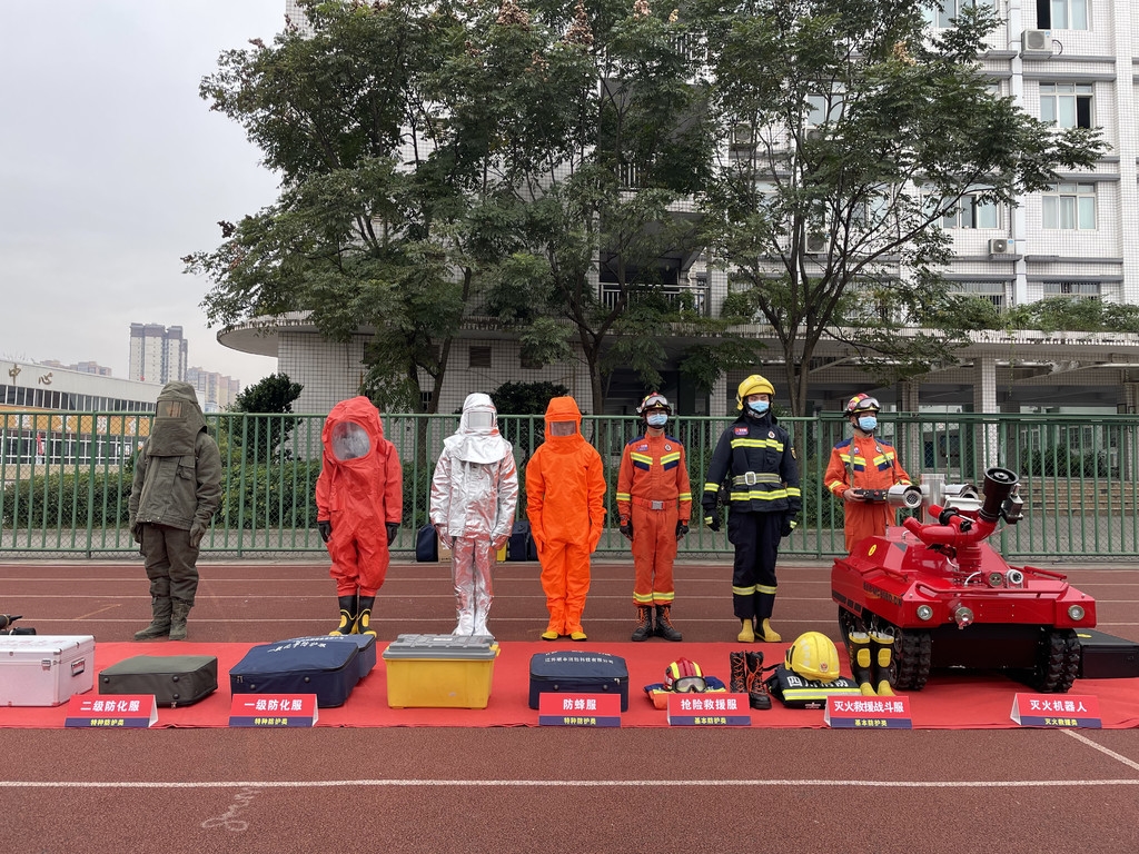 高坪三中“消防实验班”的学生们参与了线下宣传活动,作为线下消防“体验官”,他们参与了远程供水、防护服接力、搬运假人等项目体验。更让大伙儿大开眼界的是消防装备的展示。灭火机器人、防蜂服、灭火救援战斗服、一级防化服、无人照明机……当天现场的消防装备展示区共陈列了130余件消防装备。“展示的装备类型大概是总量的一半,目前南充的消防装备共有300余件,分为灭火和抢险救援两个大类。”南充市消防救援支队后勤装备科科长罗翔介绍,其中灭火机器人和照明无人机是近期南充消防添置的最新设备,灭火机器人外形像缩小版的“坦克”,搭载摄像头、热感装置等,可以帮助消防员打前站,探知火灾现场是否产生了有毒有害物质。