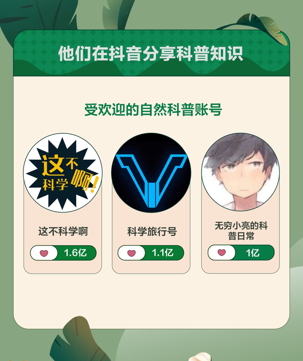 随着自然科普内容的走红,大批专业又有趣的科普创作者开始受到关注。据介绍,过去一年,抖音万粉以上自然科普账号同比增加107%。