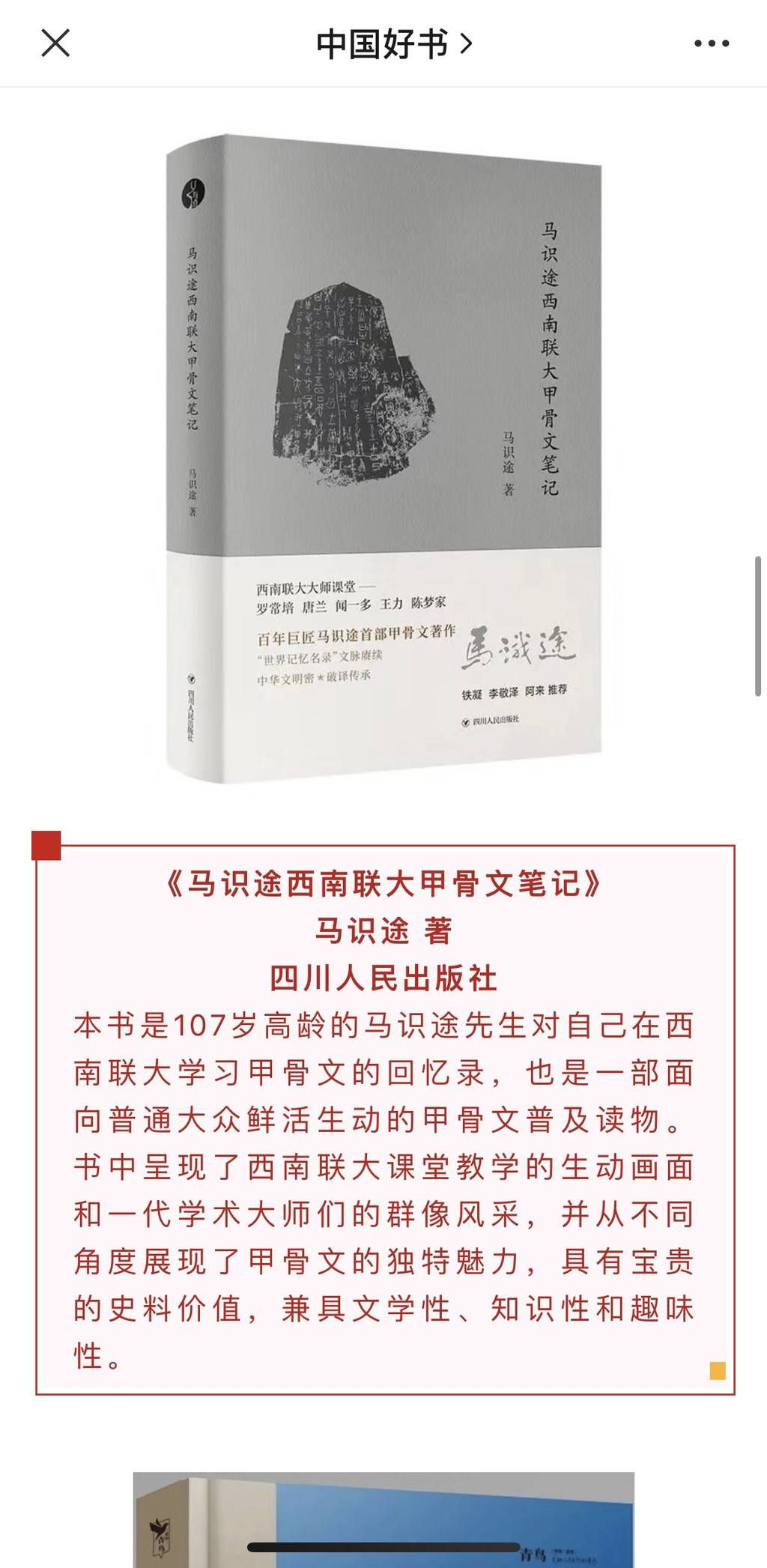 11月10日,由中国图书评论协会发布的“10月中国好书榜单”出炉,107岁高龄文学巨匠马识途的新作《马识途西南联大甲骨文笔记》入选“10月中国好书榜单”。