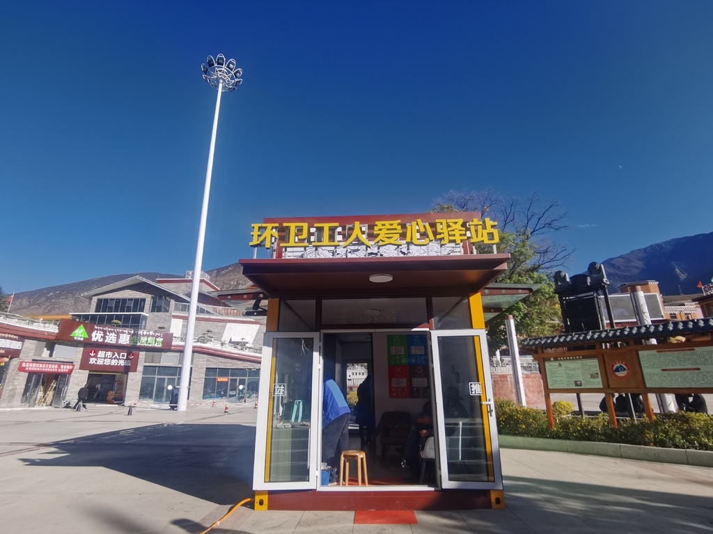 “除了环卫工人,驿站还为外卖小哥、快递员、游客及其他户外劳动者和群众免费提供歇脚、解渴、避雨等惠民暖心服务。同时,结合我县省级文明城市创建工作,爱心驿站外墙设置LED大屏,播放文明宣传片。”巴塘县综合执法局负责人赖祯鹏介绍,这是“高原江南”巴塘对环卫工人等户外劳动者辛勤付出的肯定,更是对他们的尊重与关爱。
