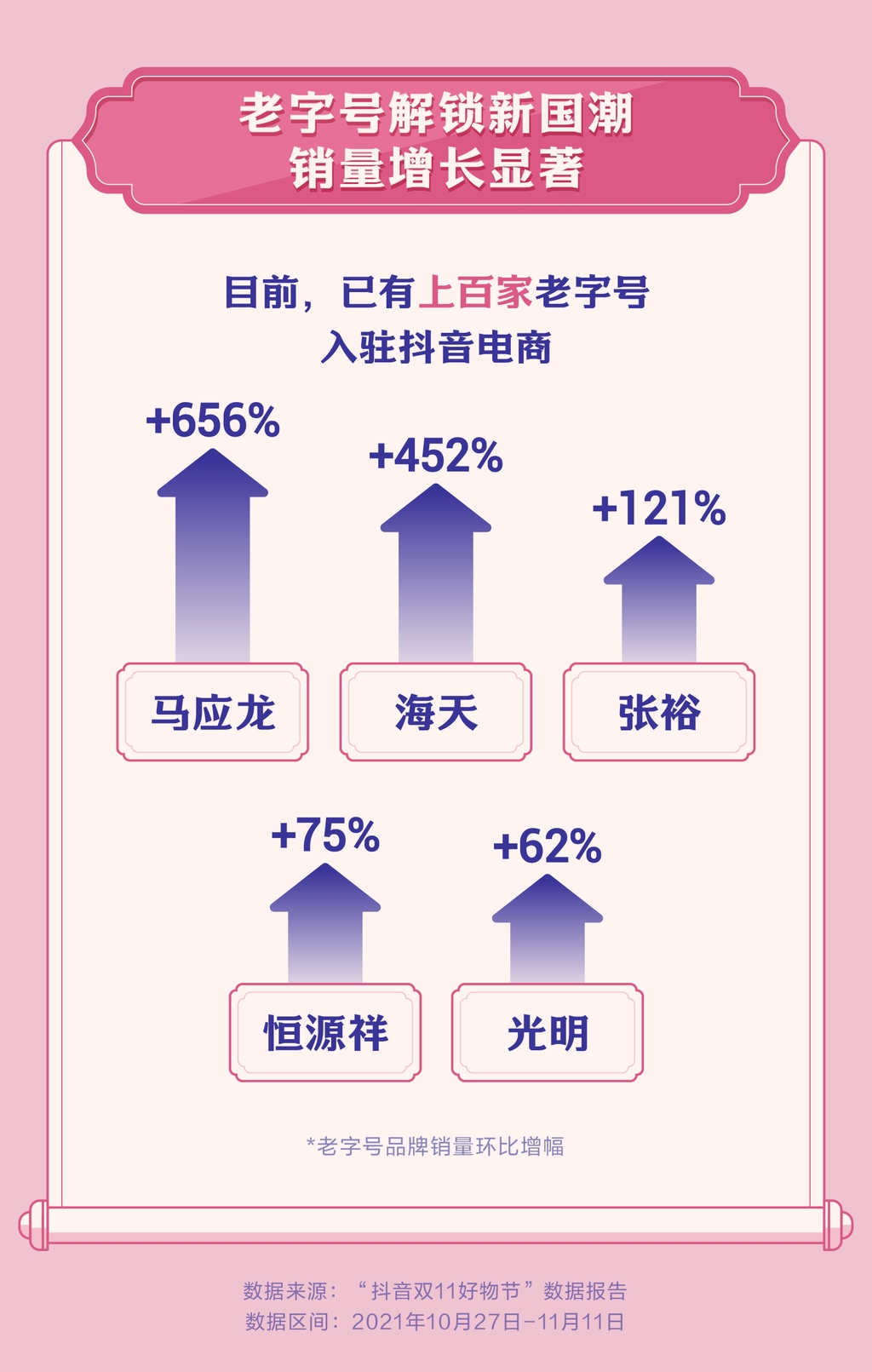 国货发展的过程中,老字号也借助兴趣电商,在传承与创新中走出国潮范。目前,已有上百家中华老字号入驻了抖音电商。报告显示,马应龙、海天、张裕销量成倍数增长,环比增幅达656%、452%和121%,恒源祥和光明的销量也环比增长了75%和62%。