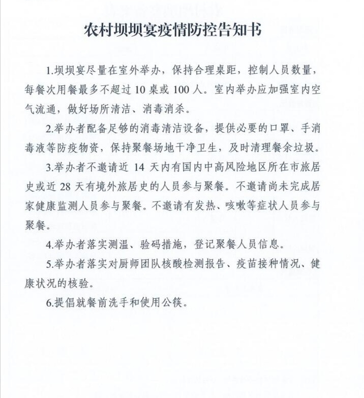 县(市、区)域内发生本土疫情期间停办坝坝宴,市(州)域内发生本土疫情期间倡导“非必要不举办”。