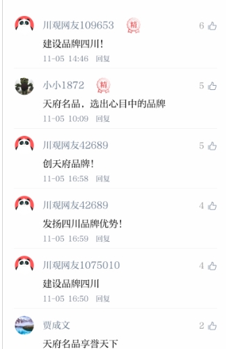 此次投票活动得到了四川在线网友的鼎力支持,四川在线粉丝群每天都相互提醒投票抽奖。不少网友反映,自己从太阳神鸟、中国红、四合院、玉玺等设计理念中,丰富了对传统文化的理解。“这些设计将中国传统文化与四川元素相结合,将天府名品质量品牌内涵通过直观的形式给予表达,体现了高端质量的金字招牌。”网友叶晶晶希望天府名品的标识和宣传语能尽快评出来,赶紧用起来。