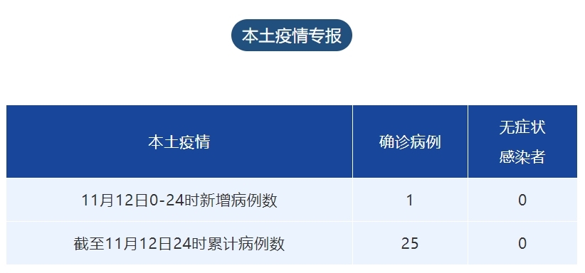 11月12日,成都市新增新冠肺炎确诊病例1例,为本土病例,新增出院1例。新增无症状感染者1例,为境外输入病例。
