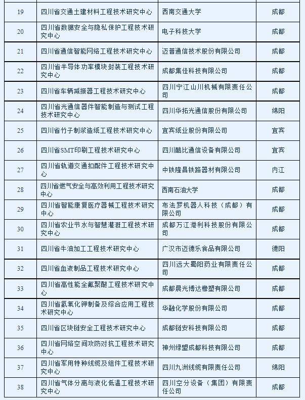 记者梳理发现,本次拟认定的工程中心共有38个,其中,成都23个,占六成以上;绵阳、宜宾各3个,德阳2个;此外,自贡、遂宁、泸州、资阳、达州、乐山、内江也各有1个新增。